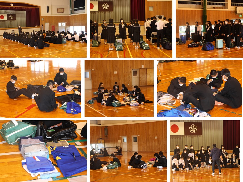 今日の午後から2年生は修学旅行の事前指導がありました。西原先生から、修学旅行の目的、みんなが楽しい修学旅行にするためにはどうしたらよいか等、具体的な説明がありました。その後、集合の仕方や隊形、そして荷物点検等を行いました。2年生はきびきびとした態度で行動できていました。月曜日からの修学旅行が楽しみです。